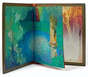 La Cité des eaux. Paris, Société du Mercure de France, 1902, in-12, maroquin vert émeraude janséniste, dos à nerfs, doublure et gardes décorées de 2 compositions originales à la gouache de Paul Chabas, couverture, tête dorée, non rogné (Durvand).
