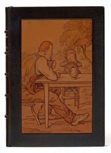 245 x 162 mm; d'un dessin original à la plume et au lavis, «M. Philippe et Joseph faisant des fagots», signé Paul Colin et daté du 11 janvier 1906. 258 x 175 mm. Dessin non décrit au catalogue Comar; de la maquette du cuir incisé; du spécimen illustré de l'ouvrage.