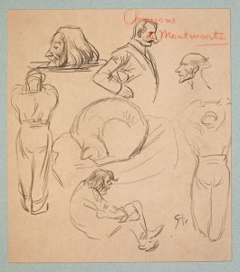 Feuille de croquis au crayon gras, recto seul, titrée au crayon rouge «Chansons de Montmartre», sur papier bistre type «Canson».