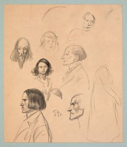 Feuille de croquis au crayon gras, recto seul, sur papier bistre type «Canson».