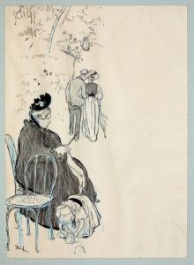 Dessin original pour la chanson «La Bonne Dame», paroles d'Henry d'Erville, musique de Georges Charton, «créée par Yvette Guilbert».