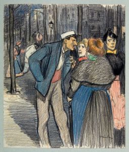 Dessin original [Une rumeur: sur le boulevard, un homme en képi s'adresse à un groupe de femmes].