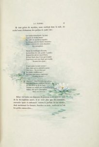 Imprimé sur papier des manufactures impériales du Japon (n° 1), il est enrichi de 130 aquarelles de Giacomelli exécutées sur les titres, dans les marges ou en encadrement des gravures. On retrouve les thèmes chers à l'illustrateur: paysages, fleurs, oiseaux, insectes... La plupart sont signées.