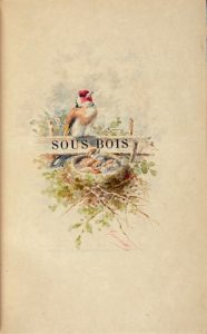 Sous bois. Paris, L. Conquet - G. Charpentier, 1883, in-8° cavalier, maroquin vert, filets dorés autour des plats, dos à nerfs orné d'un motif mosaïqué plusieurs fois répété, doublure de maroquin saumon orné d'une roulette dorée, couverture et dos, tranches dorées (Mercier Sr de Cuzin).