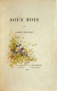 Sous bois. Paris, L. Conquet - G. Charpentier, 1883, in-8° cavalier, maroquin rouge, filets dorés autour des plats, dos à nerfs orné d'un fer à l'oiseau plusieurs fois répété, roulette intérieure dorée, couverture et dos, tranches dorées, étui gainé de même peau (Reymann).