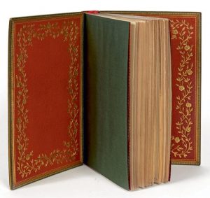 Le Chemin des bois. Paris, Lemerre, 1877, in-12, maroquin vert tilleul, filets droits et perlés autour des plats, dos à nerfs orné d'un fleuron mosaïqué plusieurs fois répété, doublure de maroquin terre de Sienne ornée en encadrement d'une guirlande florale dorée, gardes de tabis vert, couverture et dos, tranches dorées sur témoins, chemise et étui gainés de même maroquin (Mercier Sr de Cuzin).