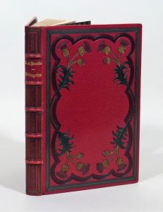 Gringoire. Paris, Louis Conard, 1904. Petit in-8, maroquin rouge, large encadrement mosaïqué en différents tons de maroquins vert, violet et jaune, formé de listels droit et courbe agrémentés de feuilles et fleurs de chardons, dos orné de listels mosaïqués vert et violet, tranches dorées, bordure intérieure ornée d'un listel de maroquin vert, doublure et gardes de soie brochée à motifs floraux, filets sur les coupes, couvertures et dos, étui (Noulhac). Édition ornée de 32 compositions par Edmond Malassis, gravées sur cuivre en couleurs par Louis Mortier.