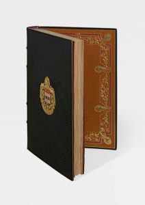 Les Princesses. Paris, Librairie des amateurs, Ferroud, 1904. In-4, maroquin bleu nuit, armes dorées et mosaïquées de maroquin rouge, blanc et bleu au centre, tranches dorées, doublure de maroquin havane, ornée d'un large encadrement doré et mosaïqué de filets, rinceaux floraux, palmettes et listels, gardes de moire pourpre, couverture et dos, étui (René Aussourd). Édition illustrée de 24 compositions de Georges Rochegrosse, gravées à l'eau-forte par Decisy, dont 21 planches hors-texte, une vignette de titre, un frontispice et un cul-de-lampe.