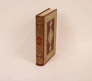 El Fiafi oua el kifar ou Le Désert. Paris, H. Piazza, 1911. In-8, maroquin havane plats ornés d’arabesques en encadrement avec écriture arabe, grand motif doré central entouré d’ornements à froid, dos orné, filets intérieurs dorés, gardes de moire, tête dorée, couverture et dos, étui (Durvand). Édition illustrée de 50 compositions en couleurs dont 25 à pleine page par Étienne Dinet.