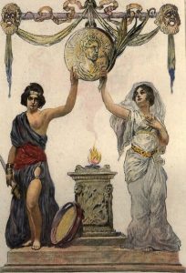 Melænis. Évreux, Imprimerie Charles Hérissey, 1909. In-4, maroquin rouge, large encadrement de multiples filets entrecoupés et dorés, dos orné de même, tranches dorées sur témoins, filets sur les coupes, doublure de maroquin rouge ornée d'une frise de grecques dorée en encadrement, doubles gardes, couverture, étui (Chambolle-Duru). Édition ornée de 17 eaux-fortes gravées en couleurs au repérage, dont 5 hors texte et un frontispice par Paul Gervais.
