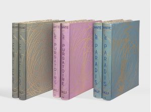 La Divine comédie. Paris, Éditions d’art Les Heures claires, 1959-1963. 6 volumes in-4, maroquin bleu, rose ou vert olive selon les tomes, plats ornés de nombreux filets dorés en cerceaux, dos orné de même avec le titre peint à la japonaise, chemise plastifiée, étui (Mercher). Édition illustrée de 100 compositions de Salvador Dalí.