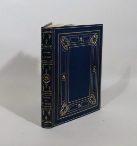 La Mort du Dauphin. Paris, Ferroud, 1907. In-4, maroquin bleu roi, plats encadrés d'un jeu de filets dorés droits et courbes avec, aux angles, une rosace dorée emprisonnant un semé de lys et au centre, un dauphin héraldique doré, dos orné de même, tranches dorées, large bordure intérieure décorée de filets et de fers dorés, doublure et gardes de soie gris perle, couverture et dos, étui (Affolter). Première édition séparée de ce conte tiré des Lettres de mon Moulin, illustrée de 22 eaux-fortes d'Octave-Denis-Victor Guillonnet, rehaussées d'or dans des encadrements ornés, de 21 fleurons et de lettres enluminées.