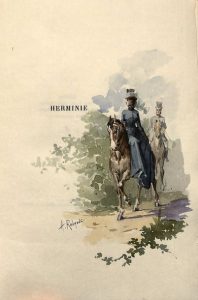 Herminie, l'Amazone. Paris, Collection Calmann Lévy-Conquet, 1888. In-8, bradel demi-maroquin vert avec coins, dos lisse, tête dorée, couverture et dos (Champs). Ouvrage illustré d’un frontispice et de 14 vignettes in-texte par Alcide Robaudi, gravés à l’eau-forte par Deville.