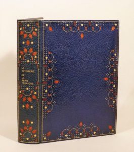 La Rôtisserie de la Reine Pédauque. Paris, Édouard Pelletan, 1911. In-4, maroquin bleu nuit, torsade dorée et jeux de points dorés, pastilles citron et flammes orange mosaïquées encadrant les plats, dos plat décoré de même, cadre intérieur, doublure et gardes de moire beige, non rogné, couverture et dos, étui (Poullain & Renard, Dijon). Édition illustrée de 176 compositions d'Auguste Leroux gravées sur bois en noir, en bistre et en sanguine par Duplessis, Ernest Florian, les deux Froment, Gusman et Perrichon.
