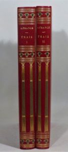 Thaïs. Paris, Collection des dix, 1900. 2 volumes in-4, bradel demi-maroquin rouge avec coins, dos lisse orné de colonnes et fleurs de lotus mosaïquées, couverture et dos, non rogné (Carayon). Édition illustrée de 65 compositions de Paul-Albert Laurens, dont 7 hors-texte, gravées à l’eau-forte par Léon Boisson.