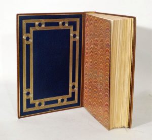 Le Puits de Sainte-Claire. Paris, Le Livre contemporain, 1908. In-4, maroquin fauve janséniste, tranches dorées, doublure de maroquin bleu nuit, encadrée d’un filet doré et d’un double jeu de six filets dorés formant entrelacs, couverture et dos, étui (Chambolle-Duru). Ouvrage illustré par Tigrane Polat de 40 eaux-fortes originales dont 17 hors-texte et de 5 planches d’essai.