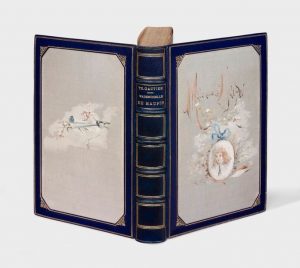 Mademoiselle de Maupin. Paris, Charpentier, 1880. In-8, maroquin bleu, encadrement de fers et filets dorés, plats ornés de compositions aquarellées sur soie, dos orné, tranches dorées, dentelle intérieure dorée (G. Malraison). Cette édition est illustrée en frontispice, d’un portrait gravé de l’auteur par Eugène Abot d’après le médaillon de David d’Angers et d'un portrait de Mademoiselle de Maupin par Gautier en fac-similé, celui-ci est remplacé ici par un portrait aquarellé par François Coindre.