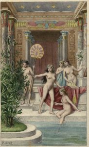 Exemplaire enrichi d’une belle aquarelle originale signée de Paul Avril, Cléopâtre au bain surprenant Meïamoun, scène décrite p. 62 (19,5 x 11,5 cm).