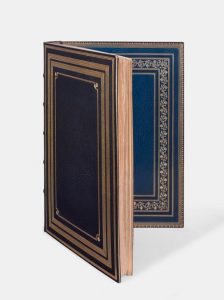 La Morte amoureuse. Paris, A. Romagnol, 1904. In-folio, maroquin bleu, quadruple encadrement de jeux de filets divers, dont le plus central à angles coupés remplacés par un fleuron, dos orné de même, tranches dorées sur témoins, doublure de maroquin bleu indigo décorée de multiples encadrements de filets pleins, perlés, gras et à froid, bordure florale, gardes de soie bleu marine, doubles gardes, couvertures et dos, étui (Mercier succ. de Cuzin). Première édition séparée de cette nouvelle extraite d’Une Larme du Diable parue en 1839.