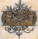 - le défect d'exemplaire d'essai de 7 feuillets doubles sous couverture imprimée de l'éditeur à la date de 1896 comportant 7 beaux dessins sur calque à la plume ou au crayon rehaussés de couleur pour 4 bandeaux et 2 vignettes. Certains sont assez proches des eaux-fortes définitives. Une suite en divers états de 20 eaux-fortes de Merson pour Les Trophées complète l'ensemble.