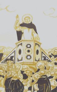 Vie de saint Dominique. Paris, Jacques Beltrand, 1919. In-4, maroquin brun janséniste, filets intérieurs dorés, doublure et gardes de soie ivoire, doubles gardes, tête dorée, couvertures et dos, étui (David). Édition ornée de 59 compositions en couleurs de Maurice Denis, gravées sur bois par Jacques Beltrand.