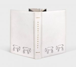 Les Pastorales de Longus ou Daphnis & Chloé. Paris, Philippe Gonin, 1937. In-8, maroquin crème, deux chèvres poussées à l'œser noir en partie basse de chaque plat, dos lisse orné du titre, des noms de l'auteur et de l'illustrateur à l'or, doublure de box noir, gardes de moire noire, tête dorée, couverture et dos, chemise et étui (Manuel Gérard). Édition illustrée de 48 bois originaux d'Aristide Maillol, dans le texte, dont un sur le titre et un sur la couverture. Traduction d'Amyot, revue et complétée par Paul Louis Courier.