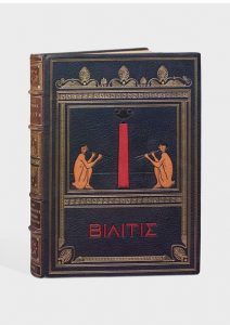 Les Chansons secrètes de Bilitis. Paris, chez l’Artiste, s.d. In-4, maroquin vert, encadrements de grecques et de palmettes dorés et, en cuir mosaïqué rose, orange et noir, deux faunes joueurs d’aulos de part et d’autre d’une colonne portant un canthare et surmontant le titre en lettres grecques, dos mosaïqué orné de filets dorés couverture et dos, doublure et gardes de soie rouge, doubles gardes (Laucournet). Édition illustrée de 6 eaux-fortes en couleurs dessinées et gravées par Édouard Chimot. Il comprend les textes originaux des 5 chansons censurées ou retirées de l’édition des Chansons de Bilitis (Paris, Devambez, 1925) dont cet ouvrage est le complément.