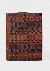Ruth et Booz. Paris, F.-L. Schmied, 1930. In-folio, maroquin brun clair orné de larges bandes mosaïquées de brun plus foncé, lignes horizontales en cuir mosaïqué beige et noir en dent-de-scie ou estampées à froid, second plat orné de même, dos lisse orné du titre doré, bande mosaïquée noire et filet à froid intérieurs, doublure et gardes de soie brune, tranches dorées, couvertures et dos, étui (Creuzevault). Édition illustrée de 28 gravures sur bois en couleurs de François-Louis Schmied, gravées et imprimées par son fils, Théo Schmied.