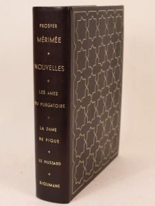 Les Âmes du Purgatoire. La Dame de pique. Le Hussard. Djoumâne. Le Carosse du Saint-Sacrement. Strasbourg, Robert Beltz, et Montrouge, Théo Schmied, 1949. 2 tomes en un volume in-4, basane maroquinée ébène, motifs orientaux au filet doré et pastilles de maroquin de couleurs répétés sur les plats, dos lisse orné du titre doré et de pastilles mosaïquées, doublure et gardes de papier peint, tête dorée, couvertures et dos, étui (Marion). Édition illustrée de 36 compositions par Robert Beltz, gravées par Théo Schmied.