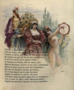 Exemplaire unique orné de cinq belles aquarelles originales signées de J. Robaglia rehaussées d'or : Le Salut à Joconde p. 3, Le Salut aux amies de Joconde p. 57, Le Baiser p. 97, La Guerre p. 159 et Fin de Règne p. 213 (entre 9 x 9 cm et 18 x 11 cm)