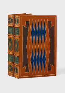 Bubu de Montparnasse. Lyon, Société Lyonnaise "Les XXX", 1929. 2 volumes in-4, maroquin lavallière, grande composition mosaïquée de losanges de maroquin bleu canard et formes géométriques de maroquin brun, sertie et encadrée de filets dorés, dos ornés du même décor, cadre intérieur orné de filets dorés, doublure et gardes de moire tabac, tête dorées, couvertures et dos, étuis (R. et. R. Mativet). Édition illustrée de 67 eaux-fortes originales, dont 10 à pleine page et une à double page, en noir, par André Dunoyer de Segonzac. Le texte est paru pour la première fois dans la Revue Blanche en 1901 et a immédiatement rendu célèbre son auteur.