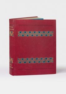 Pablo de Ségovie. Paris, Pelletan, 1902. In-4, maroquin grenat, plats décorés de deux frises dorées et mosaïquées formées chacune de triangles de maroquin bleu-gris et d’un chevron de maroquin vert-amande, dos lisse orné de même, tête dorée, cadre intérieur orné de filets dorés, doublure et gardes de soie azur, non rogné, couverture et dos, étui (René Kieffer). Ouvrage illustré de 120 compositions par Daniel Vierge.