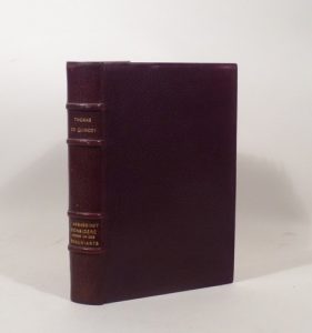 L'Assassinat considéré comme un des Beaux-Arts. Paris, EOS, 1930. In-4, maroquin mauve janséniste, doublure et gardes de moire rouge, filet doré intérieur, tranches dorées sur témoins, couverture et dos, étui (Gruel). Édition illustrée de 24 eaux-fortes originales hors texte de Gus Bofa.