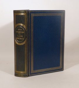 La Cité des eaux. Paris, Blaizot-Kieffer, 1912. In-4, maroquin bleu canard, encadrement de multiples filets dorés, dos orné de même avec un médaillon en relief contenant le titre de l'ouvrage, encadrement intérieur de filets dorés, doublure et gardes de soie bleue, tête dorée, non rogné, couverture et dos, étui (L. Bernard. Rel.). Édition ornée de 39 eaux-fortes originales dont 37 hors texte par Charles Jouas.