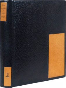 L'Illusion héroïque de Tito Bassi. Paris, La Roseraie, 1925. In-4, maroquin ébène, rectangle de maroquin brique mosaïqué sur les plats, dos lisse mosaïqué, tête noire, doublure de maroquin brique, gardes de soie noire côtelée, doubles gardes de papier peint, couverture et dos, étui (L. Creuzevault). Édition illustrée de 17 eaux-fortes hors texte en couleurs de Charles Martin dont le titre.