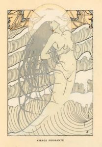 Les Litanies de la mer. Paris, Albert Bélinac, 1903. In-8, demi-maroquin vert avec coins, filets dorés, dos lisse orné de même, tête dorée, couvertures et dos (Bonnet). Édition illustrée de 53 grandes compositions en couleurs, à pleine page, aquarellées au pochoir et rehaussées d'or et d'argent par Henri Caruchet.