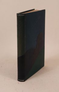 Le Malheureux petit voyage. Paris, L'Estampe moderne, 1926. In-8, maroquin bleu nuit, décor mosaïqué de maroquin bleu, ébène et vert, pointillés au palladium, petites hachures à froid, figurant un bosquet sur une colline de nuit, dos lisse, titre au palladium, cadre intérieur orné de listels vert et ébène, doublure et gardes de moire bleue, tête dorée, couverture et dos, chemise et étui (Creuzevault). Édition illustrée de 26 compositions gravées sur cuivre dont 15 hors-texte en couleurs et 11 culs-de-lampe par Gorvel d'après Umberto Brunelleschi.