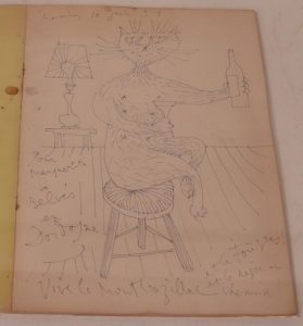 Dessin original. 10 juin [19]51. Dessin à l'encre bleue : " Pour Marguerite à Belvès en Dordogne. Vive le Montbazillac et le foie gras et le nègre en chemise !" (31 x 22 cm).
