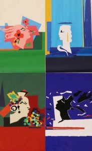 Les Quatre saisons. 1983. 4 ff. volants (18 x 11 cm) sur papier canson. Bel ensemble de quatre gouaches préparatoires non signées pour Les quatre Saisons, une série de collages figurant l’automne, l’hiver, le printemps et l’été.