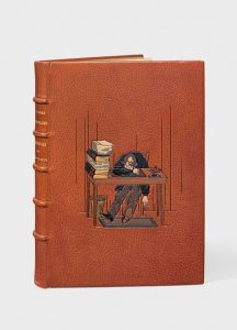Messieurs les ronds de cuir. Paris, Javal et Bourdeaux, 1927. In-4, maroquin fauve, décor bordé de filets à froid et de cuirs mosaïqués brun, noir, vert et beige représentant un personnage endormi à son bureau, entouré de livres, dos orné du titre doré, filets dorés et bande mosaïquée rouge en encadrement intérieur, objets en cuirs mosaïqués vert, brun et rouge aux coins, filets dorés sur les coupes, couvertures et dos, tête dorée (Vermorel). Édition illustrée de 15 aquarelles de Sem reproduites en couleurs par Daniel Jacomet.