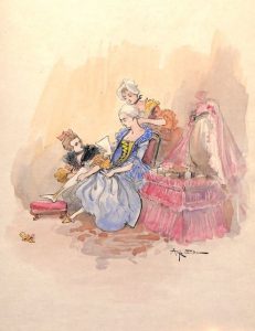 Exemplaire enrichi d'une aquarelle originale signée d'Albert Robida, Jeune femme à sa coiffeuse (16 x 16 cm).