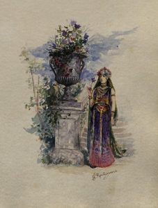 Tirage à 500 exemplaires, celui-ci, le n°15 sur grand vélin d’Arches, un des 20 de tête sur japon ou grand vélin d’Arches avec 3 états des eaux-fortes (eaux-fortes pures, avant la lettre, avec la lettre) et une aquarelle originale signée de Georges Rochegrosse : Hérodias, 11 x 8 cm, reprise à l’eau-forte p. 26.