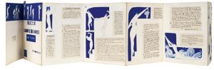 L'Homme et son désir. Poème plastique. [Paris : Nouvelle Revue Française, 1917]. In-4, en 7 volets montés en accordéon, sous chemise cartonnée bleue, contreplats ornés de papier (or et blanc pour la première doublure et or et noir pour la seconde), lacets. Édition originale manuscrite composé par Paul Claudel d'après le ballet L’Homme et son désir de Darius Milhaud.