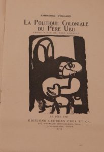 La Politique coloniale du Père Ubu. Paris, Zurich, Éditions Georges Crès et Cie, 1919. In-8, broché, couverture illustrée. Édition illustrée d'une vignette de titre par Georges Rouault, mention de 3e édition sur la couverture.