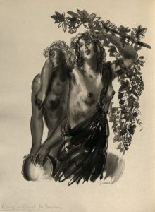– un très beau lavis original exécuté au format du livre, signé de Decaris, montrant Deux Bacchantes nues enlacées,