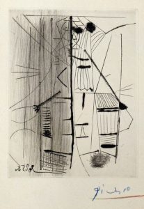 Un des 100 exemplaires numérotés et enrichis chacun d'une eau-forte originale signée au crayon arlequin par Picasso, celui-ci le n°10. Datée dans la planche 9 septembre 1958, la gravure a été réalisée au burin, à la pointe sèche et à la roulette.