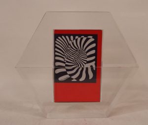 Hexagone. 1988. Sculpture de plexiglas contenant 4 volume in-8, cartonnages, emboîtage de toile noire. Édition originale de ce livre objet : une sculpture hexagonale en plaxiglas transparent contenant 4 ouvrages : Graphisme 1934-1940, 4 volumes.