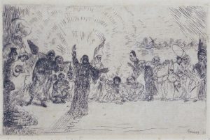 Eau-forte, cuivre, biseaux. Epreuve sur Japon 8,8 x 13,1. 1er état sur 2 (Taevernier, 102). Titrée «Le Christ aux mendiants», et signée et datée «James Ensor 1895» au crayon en dessous. Signée et datée dans la plaque en bas à gauche. En belle condition. Sous verre et passe-partout, baguette doré (au dos, étiquette de la Galerie Dietrich à Bruxelles).