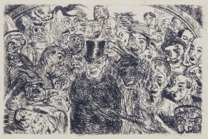 Eau-forte, cuivre, biseaux. Epreuve sur Japon 7,4 x 11,4. (Taevernier 128, pas d’état). Signée et datée «James Ensor 1904» au crayon en dessous à droite. Signée en minuscule dans la plaque en bas à gauche. En belle condition. Sous verre et passe-partout, baguette doré (au dos, étiquette de la Galerie Dietrich à Bruxelles).