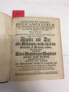 10. [ALSACE]. Etat et taxe des médicaments simples & composés, qui se trouvent & doivent se trouver chez les apothicaires de la ville de Strasbourg, faite & publiée par ordre de Messieurs du Magistrat de la dite ville. Strasbourg, Simon Kürtzner, 1759, petit in-4 carré, cartonnage de papier fauve granité, pièce de titre cerise, tranches mouchetées de rouge, [9] pp. n. ch., 128 pp., [31] pp. n. ch., texte bilingue français & allemand.